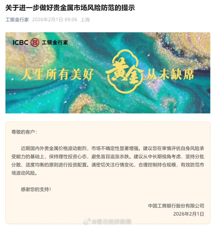 #工行3连发贵金属风险提示# 【工行三连发:提示贵金属投资风险】今天,工商银行通过"工银金行 家"公众号发布风险提示。公告显示,近期国内外贵金属价格波动剧烈,市场不确定性显著增强。工行 建议客户在审慎评估自身风险承受能力的基础上,保持理性投资心态,避免盲目追涨杀跌。工行建议客 户从中长期视角考虑,坚持分批分散、适度均衡的原则进行投资配置,同时密切关注行情变化,合理控 制持仓规模,有效防范市场波动风险。此前,工商银行还分别在1月29日及30日发布风险提示称,国际 市场复杂多变,贵金属价格波动剧烈,建议投资者理性投资。(泽塔)#多家银行就贵金属紧急提醒# ...