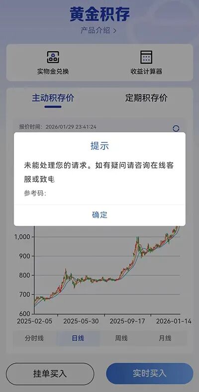 "买不进"的困局 华夏时报记者 付乐 北京报道 "眼看着金价跌了40分钟,至少指纹识别了100多次。都在抄底,抄不进去,点着点着睡着了。"有00后 投资者分享道。 近日,部分银行出现了积存金买不进,交易火爆的现象。2月3日,博通分析金融行业资深分析师王蓬博 对《华夏时报》记者表示,这一现象就是金价波动下交易需求短期集中爆发,直接超出了银行系统的承 载能力,再叠加银行主动管控交易节奏,属于运营层面的阶段性问题,不是产品底层逻辑或者市场系统 性风险的问题,而是银行端应对交易高峰的适配能力未及时跟上。 某银行积存金购买界面(由受访者供图) 1989年出生的冬冬(化名)在深圳从事房地产中介,2月3日晚上,她对本报记者表示,自己前几天在某 大行以均价1190元/克左右的价格购入积存金,陆续买入一两百克,投入资金数十万元。"当时买不进 去,之后又买进去了,买入后金价便出现波动,当前已跌至1090元/克左右。" "我是纯跟风玩一下,银行的朋友跟我说最近几个月黄金行情还行,投资有20%的收益,没想到自己刚 买入就被套牢。"冬冬直言,黄金投资赌性大、风险高,自己回本后便会撤出。 冬冬称,黄金投资短时间内可能损失本金和收益,远没 ...