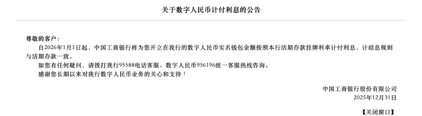 每经记者|张寿林 每经编辑|程鹏 张益铭 明天起,数字人民币实名钱包余额将开始计息。 12月31日,中国银行、工商银行、农业银行、建设银行、交通银行、邮储银行六家国有大行相继发布公告称,2026年1月1日起,将为开立在该行的数字人 民币实名钱包余额按照该行活期存款挂牌利率计付利息,计结息规则与活期存款一致。 重要公告 关于数字人民币计付利息的公告 尊敬的客户: 自2026年1月1日起,中国工商银行将为您开立在我行的数字人民币实名钱包余额按照本行活期存款挂牌利率计付利息,计结息规则 与活期存款一致。 如您有任何疑问,请拨打我行95588电话客服、数字人民币956196统一容服热线咨询。 感谢您长期以来对我行数字人民币业务的关心和支持! 中国工商银行股份有限公司 2025年12月31日 【关闭窗口】 关于数字人民币计付利息的公告 尊敬的客户: 自2026年1月1日起,中国农业银行将为您开立在我行的数字人民币变名钱包余额按照本行活期存款挂牌利率计付利息,计结 息规则与活期存款一致。 如您有任何疑问,请拨打我行95599客服电话,或者数字人民币956196统一客服热线咨询。 感谢您长期以来对我行数字人民币业务的关心和 ...