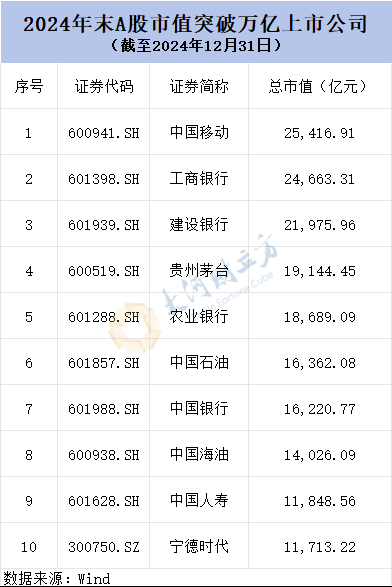 【大河财立方 记者 李文玉】2025年A股刚刚落下帷幕。 纵观全年,在政策支持、流动性充裕与产业趋势向好的共同驱动下,A股市场稳步上行,演绎出长牛、 慢牛与结构牛并存的鲜明特征。 这一年,万亿市值上市公司新增3家,千亿市值公司显著扩容,A股总市值在今年也首次突破100万亿 元,资本市场迈入量质齐升的新阶段。 在总市值突破进程中,科技企业无疑是核心驱动力之一,以AI、半导体为代表的科技行情贯穿全年, 成为这轮慢牛行情的最强主线。 万亿市值公司扩容, 科技股纷纷入列 过去一年,A股头部公司格局整体稳固,强者恒强,金融、能源等传统行业巨头地位依然坚实,但内部 结构已显现新的变化,科技力量正加速向万亿阵营攀升。 2024年末,A股市值排名中仅有10家万亿级上市公司、3家两万亿级上市公司,其中除中国移动、宁德 时代外,几乎被金融、能源等传统行业巨头所垄断,工商银行、建设银行、农业银行更是包揽前五名中 的三个席位。 | | | 2024年不怕放 【日天10/J 上 公 | | | --- | --- | --- | --- | | | | (截至2024年12月31日) | | | 序号 | 证券代码 | 证券简称 | ...