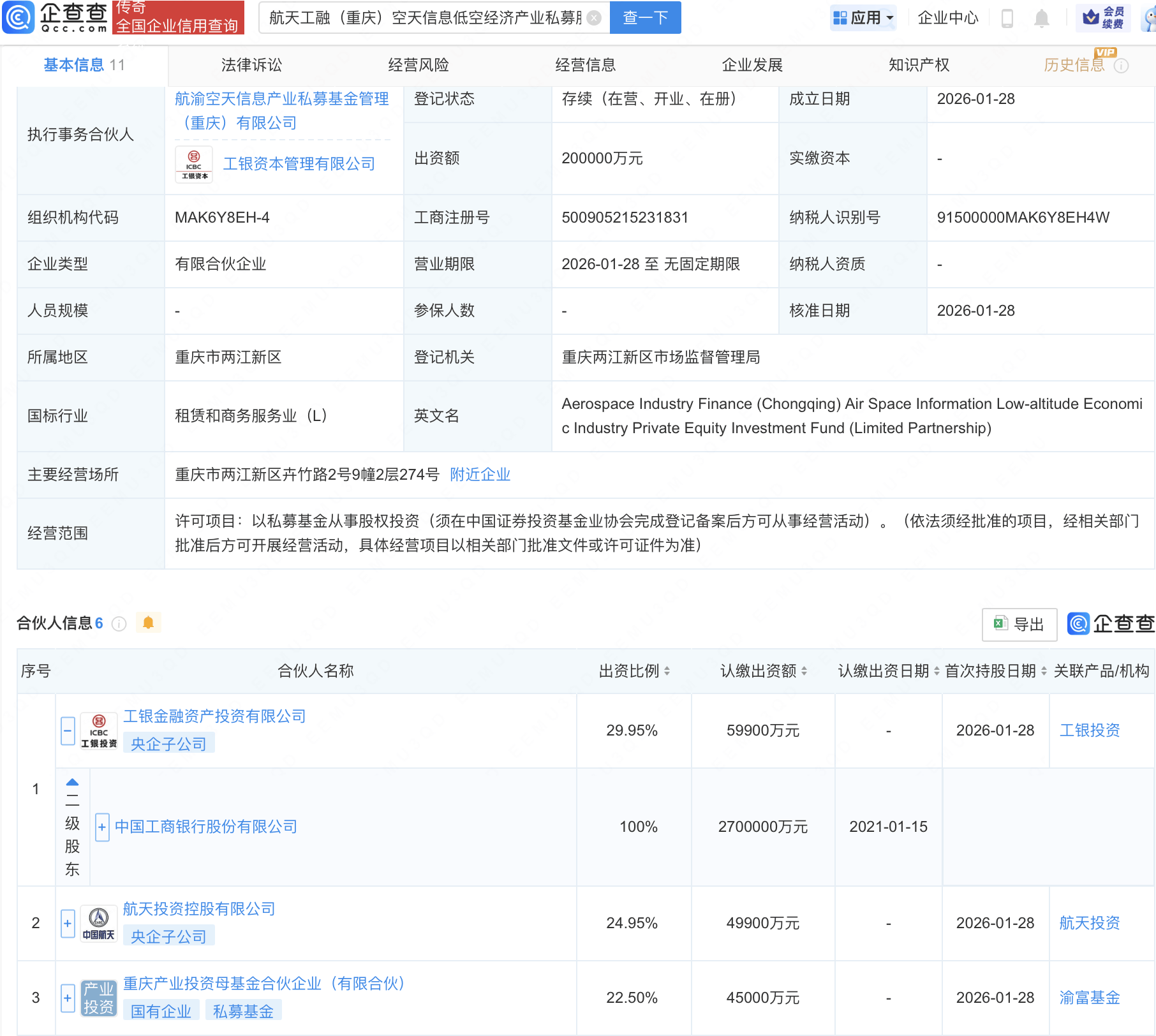 重庆产业投资母基金合伙企业(有限合伙) s // 3 国有企业 私募基金 22.50% 企查查APP显示,近日,航天工融(重庆)空天信息低空经济产业私募股权投资基金(有限合伙)成立,出资额20亿元,经营范围包含:以私募基金从事股 权投资。企查查股权穿透显示,该企业由航天投资控股有限公司、工商银行(601398)全资子公司工银金融资产投资有限公司等共同出资。 | 全国企业信用查询 | | 航天工融(重庆)空天信息低空经济产业私募服 > | 查一下 | | --- | --- | --- | --- | | 基本信息 11 | 法律诉讼 | 经营风险 | 经营信息 | | 执行事务合伙人 | 航渝空天信息产业私募基金管理 (重庆) 有限公司 | 登记状态 | 存续(在营、开业、 | | | 工银资本管理有限公司 | 出资额 | 200000万元 | | 组织机构代码 | MAK6Y8EH-4 | 工商注册号 | 500905215231831 | | 企业类型 | 有限合伙企业 | 营业期限 | 2026-01-28 至 无固ス | | 人员规模 | | 参保人数 | | | 所属地区 | 重庆市两江新区 | 登 ...