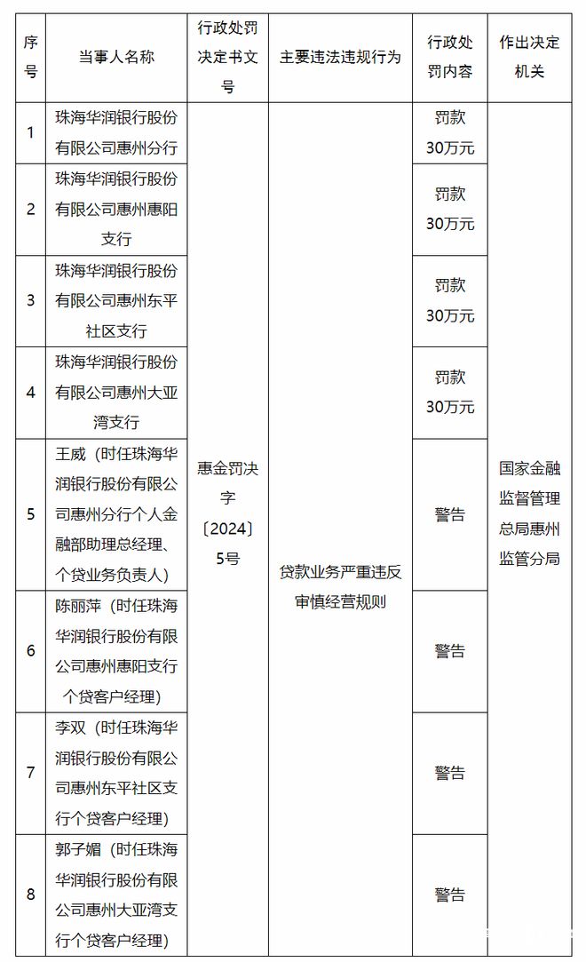 近日,南都N视频记者从国家金融监督管理总局广东监管局了解到,2025年,惠州监管分局共披露8张 罚单,涉及6家银行、3家保险公司及16名相关从业人员,累计罚款434.5万元。其中罚款最高的为珠海 华润银行股份有限公司,总计罚款达120万元。 | 序 | 当事人名称 | 行政处罚 决定书文 | 主要违法违规行为 | 行政处 | 作出决定 | | --- | --- | --- | --- | --- | --- | | 름 | | | | 罚内容 | 机关 | | | | 름 | | | | | 1 | 珠海华润银行股份 | | | 罚款 | | | | 有限公司惠州分行 | | | 30万元 | | | 2 | 珠海华润银行股份 有限公司惠州惠阳 | | | 罚款 | | | | | | | 30万元 | | | | 支行 | | | | | | 3 | 珠海华润银行股份 有限公司惠州东平 | | | 罚款 | | | | | | | 30万元 | | | | 社区支行 | | | | | | 4 | 珠海华润银行股份 有限公司惠州大亚 | | | 罚款 | | | | | | | 30万元 | | | | ...
