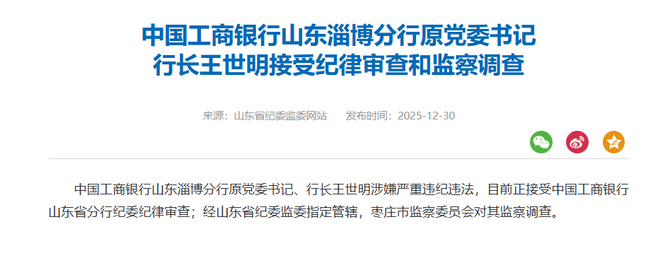 人民财讯12月30日电,山东省纪委监委消息,中国工商银行山东淄博分行原党委书记、行长王世明涉嫌 严重违纪违法,目前正接受中国工商银行山东省分行纪委纪律审查;经山东省纪委监委指定管辖,枣庄 市监察委员会对其监察调查。 转自:证券时报 ...