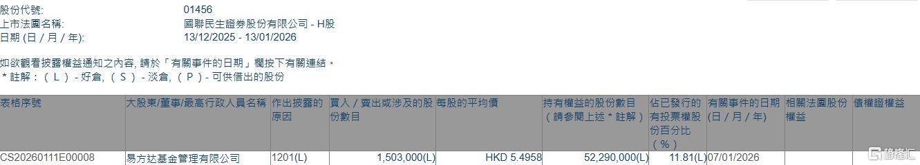 格隆汇1月13日丨根据联交所最新权益披露资料显示,2026年1月7日,国联民生(01456.HK)遭易方达基金管理有限公司在场内以每股均价5.4958港元减持 150.3万股,涉资约826.02万港元。 减持后,易方达基金管理有限公司最新持股数目为5229万股,持股比例由12.15%下降至11.81%。 | 股份代號: | 01456 | | --- | --- | | 上市法國名稱: | 國聯民生證券股份有限公司 - H股 | | 日期 (日 / 月 / 年): | 13/12/2025 - 13/01/2026 | | 表格序號 | 大股東/董事/最高行政人員名稱 作出披露的 買入 / 賣出或涉及的股 每股的平均價 | | | | 持有權益的股份數目 佔已發行的 有關事件的 | | --- | --- | --- | --- | --- | --- | | | 分數目 | 原因 | | | (請參閱上述*註解)有投票權股 (日/月/年 | | | | | | | 份百分比 | | and and the production of the control of the production of the ...