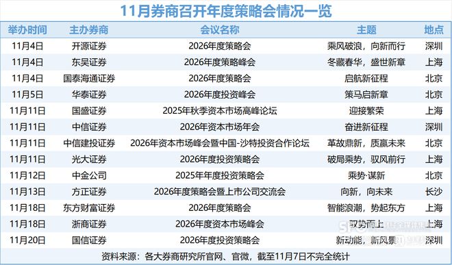 记者丨孙永乐 编辑丨巫燕玲 11月以来,券商2026年度策略会进入密集举办期,研究大咖与资深专家、行业领袖围绕市场热点及2026 年投资策略分享真知灼见,吸引公募、私募、银行、保险、上市公司等各类投资者参与交流。 21世纪经济报道记者注意到,本周已有开源证券、东吴证券、国泰海通证券、华泰证券等4家卖方机构 召开2026年度策略会,对即将到来的2026年的宏观经济形势、"十五五"规划、资本市场投资策略、上市 公司高质量发展前景等进行展望和探讨。 11月4日,东吴证券"冬藏春华,盛世新章"2026年度策略峰会在上海开幕,议题围绕泛AI、创新药、反 内卷等多个热门领域; 11月4日,开源证券召开2026年度策略会,以"乘风破浪,向新而行"为主题,展望2026年宏观经济形 势、"十五五"规划、资本市场投资策略; 据记者不完全统计,进入11月密集举办期,还将有9家券商陆续举办2026年度策略会,包括国盛证券、 中信证券、中信建投证券、光大证券、中金公司、方正证券、东方财富证券、浙商证券、国信证券等。 | | | 11月券商召开年度策略会情况一览 | | | | --- | --- | --- | --- | --- | ...