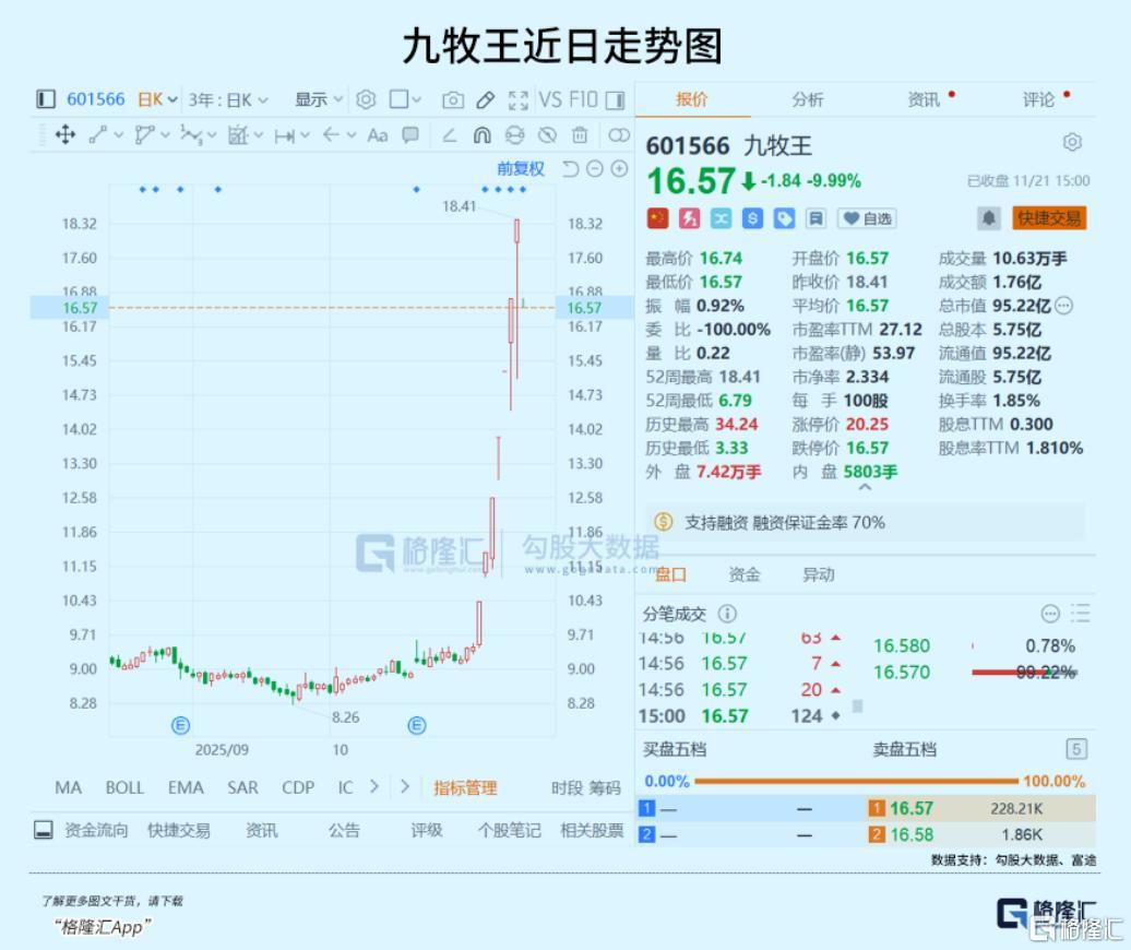 10 月底 ,九牧王交出了一份 净利润暴涨 129.63% 的三季报 。而就在半个月后的业绩说明会当天,九牧王开始了这一轮疯狂涨势 。 作者 | 远禾 数据支持 | 勾股大数 据(www.gogudata.com) 近一段时间, A 股各种概念轮番上阵,其中,"福建"概念相当凶猛。 代表企业九牧王收获 7 连板,几天时间股价翻倍, 11 月 20 日,九牧王甚至还上演了"天地天"的疯狂过山车行情。 然而,就在 11 月 21 日,情况急转直下,九牧王直接跌停。 概念炒作的背后,公司基本面改善了吗? 01 这一轮九牧王的股价上涨,直接催化因素是, 11 月 11 日,公司官方宣布与中国奥委会达成战略合作。 尽管九牧王在公告中表示股价大涨与成为赞助商的消息 " 不存在直接关联 " , 但随着公司定位从之前的 "中国体育代表团礼服供应商"升级 为" 2025-2028 中国奥委会官方赞助商",无疑带来了潜在利好。 然而,细究这一合作的历史背景 可以 发现, 早 在 2025 年 9 月底 ,九牧王 已释放过类似消息,但当时市场反应平淡。 此次股价爆发,最主要的原因,还是赶上了近期的 "福建"概念炒作。 回看公司基本 ...