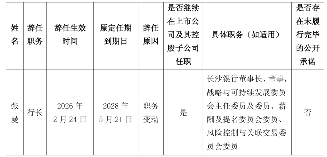 2月26日,长沙银行连发两则公告,一方面披露董事会收到张曼书面辞职报告,其因职务变动申请辞去行长职务, 辞任自2026年2月24日起生效;另一方面明确,在新任行长任职资格获监管核准并就任前,由张曼代为履行行长职 责,保障经营平稳过渡。 辞任后,张曼将继续担任该行董事长、董事,战略与可持续发展委员会主任委员及委员、薪酬及提名委员会委 员、风险控制与关联交易委员会委员职务。 | | | | | | 是否继续 在上市公 | | 是否存 在未履 | | --- | --- | --- | --- | --- | --- | --- | --- | | 姓 名 | 辞任 职务 | 辞任生效 时间 | 原定任期 到期日 | 辞任 原因 | 司及其控 | 具体职务(如适用) | 行完毕 | | | | | | | 股子公司 | | 的公开 | | | | | | | 任职 | | 摩诺 | | | | | | | | 长沙银行董事长、董事, | | | | | | | | | 战略与可持续发展委员 | | | 张 | 行长 | 2026 年 | 2028 年 | 职务 | 是 | 会主任委员及委员、新 | 否 | | वे ...