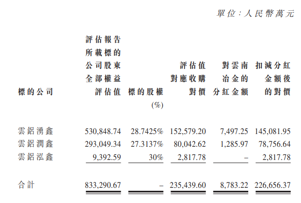 根据披露,中联评估采用资产基础法和收益法进行估值定价,按照这两套方法,云铝涌鑫估值分别为 30.38亿元及53.08亿元,云铝润鑫估值分别为19.39亿元及29.3亿元,这两家标的最终定价均采用收益 法,估值差达32.61亿元。而云铝泓鑫因为亏损,采用资产基础法估值为0.94亿元。 | | 評估報告 | | | | | | --- | --- | --- | --- | --- | --- | | | 所載標的 | | | | | | | 公司股東 | | 評估值 | 對雲南 扣減分紅 | | | | 全部權益 | | 對應收購 | 冶金的 | 金額後 | | 標的公司 | 評估值 標的股權 | | | 對價 分紅金額 | 的對價 | | | | (%) | | | | | 雲鋁湧鑫 | 530.848.74 | | 28.7425% 152,579.20 | 7.497.25 145.081.95 | | | 雲鋁潤鑫 | 293.049.34 | 27.3137% | 80.042.62 | 1.285.97 | 78.756.64 | | 雲鋁 泓鑫 | 9.392.59 | 30% | 2.817.7 ...