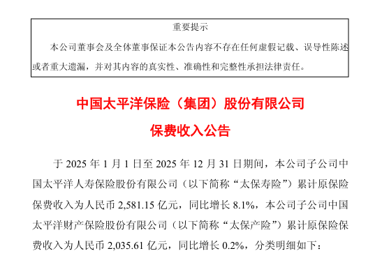中国太保:2025年太保寿险累计原保险保费收入2581.15亿元,同比增长8.1%