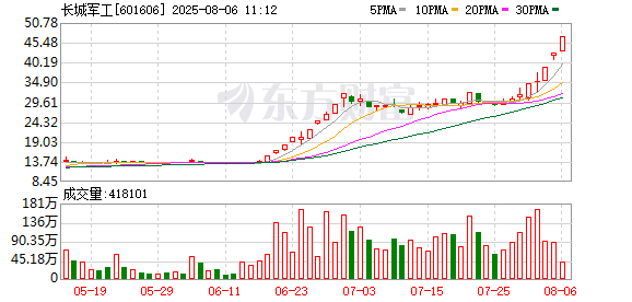 龙虎榜数据显示,该股因连续三个交易日内,涨幅偏离值累计达20%、日振幅值达15%上榜龙虎榜1 次,买卖居前营业部中,沪股通累计净买入3.48亿元,营业部席位合计净买入9650.63万元。 4月26日公司发布的一季报数据显示,一季度公司共实现营业总收入1.48亿元,同比增长5.09%,实现净 利润-0.54亿元,同比下降55.14%。(数据宝) 长城军工再度涨停,5个交易日内录得4个涨停,累计涨幅为49.00%,累计换手率为74.23%。截至9:38, 该股今日成交量3969.86万股,成交金额18.11亿元,换手率5.48%。最新A股总市值达340.24亿元。 证券时报·数据宝统计,两融数据来看,该股最新(8月5日)两融余额为6.16亿元,其中,融资余额6.10 亿元,较前一个交易日增加7252.68万元,环比增长13.51%,近5日累计增加1.38亿元,环比增长 29.22%。 近日该股表现 | 日期 | 当日涨跌幅(%) | 换手率(%) | 主力资金净流入(万元) | | --- | --- | --- | --- | | 2025.08.05 | 9.99 | 12.33 | 1293.49 | | ...
