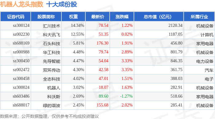 证券之星消息,10月20日,机器人龙头(980071)指数报收于2507.49点,涨1.63%,成交342.68亿元,换手率2.3%。当日该指数成份股中,上涨 的有44家,中信重工以10.0%的涨幅领涨,下跌的有6家,东方精工以1.45%的跌幅领跌。 | 证券代码 | 股票简称 | 权重 | 最新价 | 涨跌幅 | 总市值(亿元) | | 所属行业 | | --- | --- | --- | --- | --- | --- | --- | --- | | sz300124 | 汇川技术 | 14.34% | 78.54 | 1.22% | | 2120.34 | > 机械设备 | | sz002230 | 科大讯飞 | 12.55% | 51.35 | 0.02% | | 1187.05 | 十算机 | | sh688169 | 石头科技 | 5.81% | 176.30 | 1.91% | | 456.80 | 家用申器 | | sz000988 | 华工科技 | 4.48% | 79.74 | 2.89% | | 801.79 | 机械设备 | | sz300450 | 先导智能 | 4.47% | 54 ...