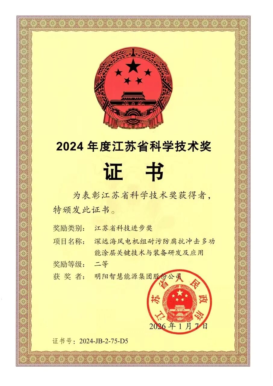 为表彰江苏省科学技术奖获得者, 特颁发此证书。 奖励类别: 江苏省科技进步奖 深远海风电机组耐污防腐抗冲击多功 项目名称: 能涂层关键技术与装备研发及应用 (来源:江苏省可再生能源行业协会) 2024 年度江苏省科学技术奖 证 书 奖励等级: 二等 获 奖 者: 明阳智慧能源集团股 证书号:2024-JB-2-75-D5 近日、江苏省人民政府公布了《省政府关于2024年度江苏省科学技术奖励的决定》。由明阳智能、南京大学、南通大学、海安南 京大学高新技术研究院、上海海隆赛能、江苏科辉环境等高校、科研院所及企业联合申报的"深远海风电机组长效耐污防腐抗冲 击涂层关键技术装备及应用"项目,明阳集团凭借突出的技术创新、显著的产业化成效和重要的行业影响力,荣获江苏省科技进 步奖二等奖。 此项目针对深远海环境高湿度、高盐雾、长日照、浪花飞溅等特点,常规防腐涂料无法满足海上风电设施防护要求及国外品牌几 乎垄断海工涂料的行业难题和痛点。在国家 973 计划重点研发计划等项目支持下,经过多年联合技术攻关,研发出无机纳米增强 耐候耐污重防腐涂层、聚天门冬氨酸酯涂层等系列高端产品及其节能规模化工艺装备,实现了电机用钕铁硼、机组核心系 ...