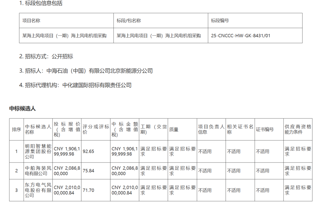 (来源:风芒能源) 招标公告要求,投标人提供的风电机组整机及部件的设计、制造、组装和测试验收应符合通用的国际国内标准规范。投标人提供的风电机组应是单机容量 为10MW,适用于本项目所在海域环境条件的海上抗台型机组,正常运行环境温度-10~45℃(在此范围内不得因温度变化原因降功率运行),生存环境温 度-20~50℃,50年一遇极大风速满足70m/s。投标机型设计使用寿命应不小于25年。 | 排序 | 中标候选/ 名称 | 投 标 报 价 含 增 值 | 评分或评标 价 | 中 标 金 标 金 额 | 工期(交货 | 质量 | 信息 | 项目负责人 相关 证书名 证书编号 信息 称 | | 供应商资格 能力条件 | | --- | --- | --- | --- | --- | --- | --- | --- | --- | --- | --- | | | | 税) | | 税) | 期) | | | | | | | | 源集团股份 公司 | 明 阳 智 慧 能 CNY 1,906,1 原集 团 股 份 86.666.66 | 92.65 | 99.999.98 | CNY 1,906,1 满足招标要 满足招标 ...