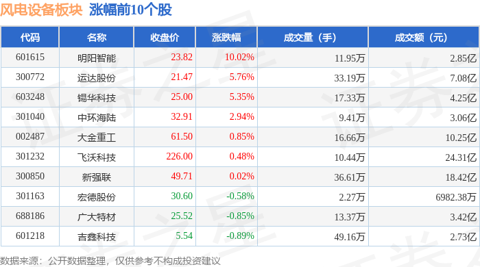 证券之星消息,1月26日风电设备板块较上一交易日下跌0.93%,泰胜风能领跌。当日上证指数报收于 4132.61,下跌0.09%。深证成指报收于14316.64,下跌0.85%。风电设备板块个股涨跌见下表: | 代码 | 名称 | 主力净流入(元) | 主力净占比 游资净流入(元) | | 游资净占比 散户净流入(元) | | 散户净占比 | | --- | --- | --- | --- | --- | --- | --- | --- | | 601615 明阳智能 | | 7452.42万 | 26.17% | -3707.58万 | -13.02% | -3744.84万 | -13.15% | | 603248 锡华科技 | | 2563.44万 | 6.03% | 1270.98万 | 2.99% | -3834.42万 | -9.02% | | 300772 运达股份 | | 1220.83万 | 1.72% | -1257.12万 | -1.78% | 36.29万 | 0.05% | | 603218 日月股份 | | 773.12万 | 3.57% | -231.85万 | -1.07% | ...