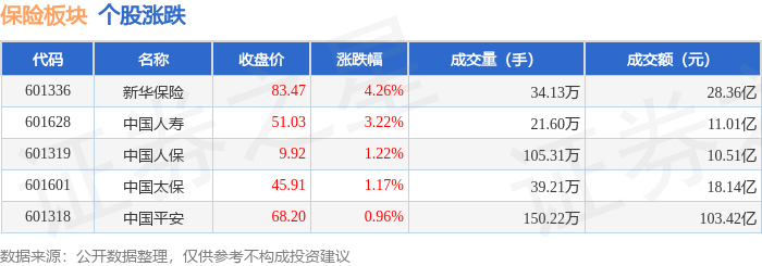 | 代码 | 名称 | 主力净流入 (元) | 主力净占比 游资净流入 (元) | | 游资净占比 散户净流入 (元) | | 散户净占比 | | --- | --- | --- | --- | --- | --- | --- | --- | | 601336 新华保险 | | 2.12亿 | 7.48% | -4103.19万 | -1.45% | -1.71 Z | -6.04% | | 601628 中国人寿 | | 1.04亿 | 9.43% | -1963.16万 | -1.78% | -8424.28万 | -7.65% | | 601601 中国太保 | | -2338.98万 | -1.29% | -3847.51万 | -2.12% | 6186.48万 | 3.41% | | 601319 中国人保 | | -4142.34万 | -3.94% | 2601.88万 | 2.47% | 1540.46万 | 1.47% | | 601318 中国平安 | | -7.18亿 | -6.94% | 1.22亿 | 1.18% | 5.97亿 | 5.77% | 从资金流向上来看,当日保险板块主 ...