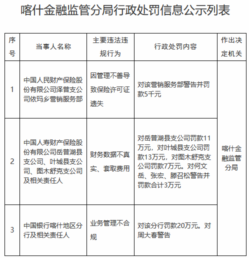 以下为原文: | 序 | 当事人名称 | 主要违法违 | 行政处罚内容 | 作出决 | | --- | --- | --- | --- | --- | | 름 | | 规行为 | | 定机关 | | 1 | 中国人民财产保险股 份有限公司泽普支公 | 因管理不善导 致保险许可证 | 对该营销服务部警告并罚 款5千元 | | | | 司依玛乡营销服务部 | 遗失 | | | | 2 | 中国人寿财产保险股 份有限公司岳普湖县 支公司、叶城县支公 | 实、套取费用 | 对岳普湖县支公司罚款11 万元,对叶城县支公司罚 款13万元,对图木舒克支 公司罚款7万元。对何文 | 喀什金 融监管 分局 | | | | 财务数据不真 | | | | | 司、图木舒克支公司 | | 岳、张宏、滕召松警告并 | | | | 及相关责任人 | | 罚款合计3万元 | | | 3 | 中国银行喀什地区分 行及相关责任人 | 业务管理不合 规 | 对该分行罚款20万元。对 周大春警告 | | 中国经济网北京12月31日讯 国家金融监督管理总局网站近日公布的喀什金融监管分局行政处罚信息公 示列表显示,中国人民财产保险股份有限公司泽普支公 ...