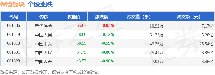 证券之星消息,11月28日保险板块较上一交易日下跌0.67%,中国人寿领跌。当日上证指数报收于 3888.6,上涨0.34%。深证成指报收于12984.08,上涨0.85%。保险板块个股涨跌见下表: | 代码 | 名称 | 收盘价 | 涨跌幅 | 成交量(手) | 成交额(元) | | | --- | --- | --- | --- | --- | --- | --- | | 601336 | 新华保险 | 65.67 | 0.03% | 10.92万 | | 7.17亿 | | 61319 | 中国人保 | 8.66 | -0.12% | 61.32万 | | 5.28亿 | | 601318 | 中国平安 | 66'88 | -0.59% | 43.36万 | | 25.54亿 | | 601601 | 中国太保 | 34.75 | -0.86% | 25.41万 | | 8.85 亿 | | 601628 | 中国人寿 | 43.52 | -0.98% | 7.93万 | | 3.46亿 | 以上内容为证券之星据公开信息整理,由AI算法生成(网信算备310104345710301240019号),不构成 ...