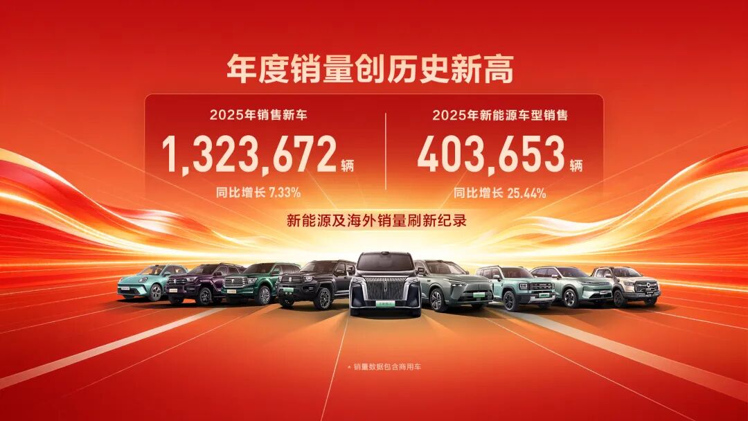 时光不语,方见初心力量;深耕不辍,终成时代回响。 在万物速朽、喧嚣逐利的时代,真正的长期主义,从不是被动等待的坚守,而是主动深耕的清醒——不困于一时的市场起伏,不惑于短期的利益诱惑,以 技术为锚,以价值为舵,在时间的长河中沉淀竞争力,在行业的变革中把握主动权。 长城汽车(601633)三十五载的发展轨迹,恰是对这份哲思的生动诠释:它拒绝"规模至上"的短期博弈,坚守"技术驱动"的长期信仰,将每一份研发投入 都化作成长的养分,将每一次技术突破都凝成前行的底气。 2026年1月30日,长城汽车披露了2025年度业绩快报,结合1月初公布的全年销量数据,公司以"营收亮眼、销量新高、结构优化"的三重答卷,在行业竞争 白热化的背景下彰显了强劲发展韧性。 数据显示,2025年长城汽车营业总收入2,227.9亿元,同比增长10.19%,创历史新高。2025年长城汽车全年销售新车超132万辆,同比增长7.33%;新能源 车型销量超40.3万辆,同比激增25.44%,增速远超行业平均水平;海外市场销售超50.6万辆,同比增长11.68%。 在汽车行业新能源渗透率突破50%、价格战持续蔓延的2025年,长城汽车并未陷入"以价换量"的 ...