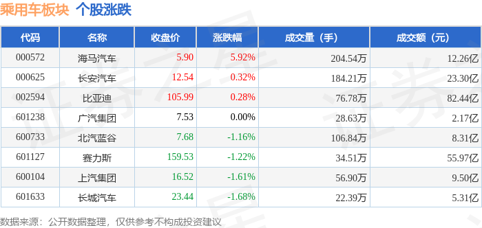 | 代码 | 名称 | 主力净流入(元) | 主力净占比 游资净流入 (元) | | 游资净占比 散户净流入 (元) | | 散户净占比 | | --- | --- | --- | --- | --- | --- | --- | --- | | 000625 长安汽车 | | 1.39亿 | 9.32% | -6276.59万 | -4.21% | -7623.45万 | -5.11% | | 601633 长城汽车 | | 869.50万 | 1.63% | -1432.68万 | -2.69% | 563.18万 | 1.06% | | 601238 广汽集团 | | -1711.84万 | -6.81% | 558.62万 | 2.22% | 1153.22万 | 4.59% | | 000572 海马汽车 | | -2191.08万 | -4.41% | 433.56万 | 0.87% | 1757.51万 | 3.54% | | 600733 北汽蓝谷 | | -6190.11万 | -7.46% | -1702.93万 | -2.05% | 7893.04万 | 9.51% | | 600104 ...