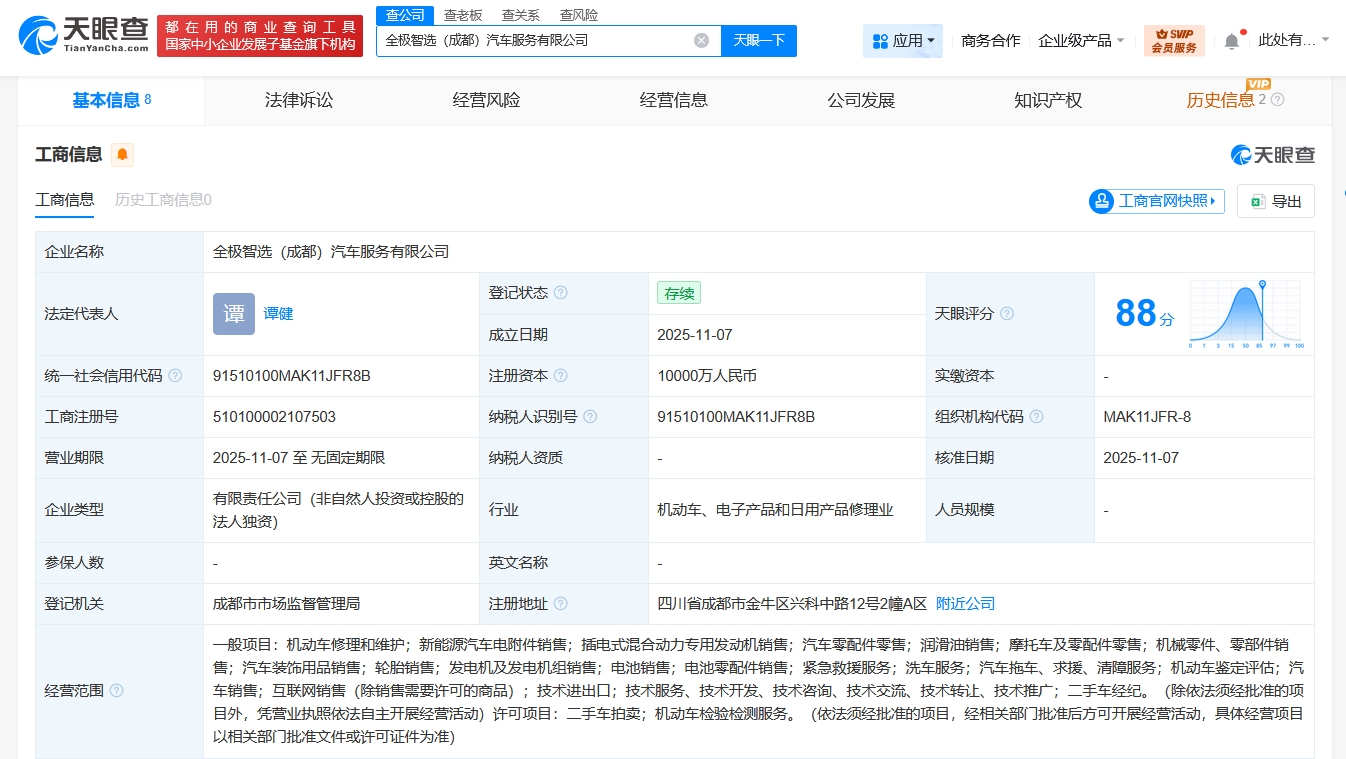 天眼查工商信息显示,近日,全极智选(成都)汽车服务有限公司成立,法定代表人为谭健,注册资本 1亿人民币,经营范围含机动车修理和维护、新能源汽车电附件销售、插电式混合动力专用发动机销 售、汽车零配件零售、润滑油销售、摩托车及零配件零售、二手车经纪、二手车拍卖等。股权全景穿透 图显示,该公司由长城智选信息科技(保定)有限公司全资持股,后者为长城汽车(601633)全资子公 司。 天眼查工商信息显示,近日,全极智选(成都)汽车服务有限公司成立,法定代表人为谭健,注册资本 1亿人民币,经营范围含机动车修理和维护、新能源汽车电附件销售、插电式混合动力专用发动机销 售、汽车零配件零售、润滑油销售、摩托车及零配件零售、二手车经纪、二手车拍卖等。 ...