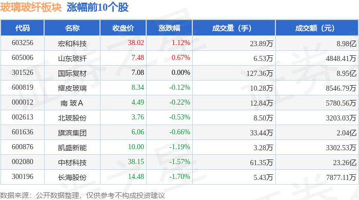 证券之星消息,12月26日玻璃玻纤板块较上一交易日上涨0.24%,九鼎新材领涨。当日上证指数报收于 3963.68,上涨0.1%。深证成指报收于13603.89,上涨0.54%。玻璃玻纤板块个股涨跌见下表: | 代码 | 名称 | 收盘价 | 涨跌幅 | 成交量(手) | 成交额(元) | | --- | --- | --- | --- | --- | --- | | 002201 | 九鼎新材 | 12.45 | 9.98% | 43.70万 | 5.44亿 | | 603601 | 再升科技 | 13.34 | 9.98% | 443.06万 | 57.95亿 | | 600293 | 三峡新材 | 3.36 | 5.66% | 76.82万 | 2.53亿 | | 600586 | 金晶科技 | 6.33 | 2.10% | 1 77.47万 | 4.92亿 | | 301526 | 国际复材 | 7.08 | 1.29% | 136.24万 | 9.64亿 | | 601636 | 旗滨集团 | 6.10 | 0.49% | 36.16万 | 2.2217 | | 000012 | 南 玻 A | 4 ...