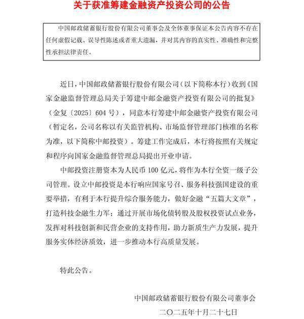 中国网财经10月28日讯 10月27日,邮储银行发布公告称,近日,该行收到《国家金融监督管理总局关 于筹建中邮金融资产投资有限公司的批复》(金复〔2025〕604号),同意邮储银行筹建中邮金融资产投 资有限公司(暂定名,公司名称以有关监管机构、市场监督管理部门核准的名称为准,以下简称中邮投 资)。筹建工作完成后,邮储银行将按照有关规定和程序向国家金融监督管理总局提出开业申请。中邮 投资注册资本为人民币100亿元,将作为邮储银行全资一级子公司管理。 ...