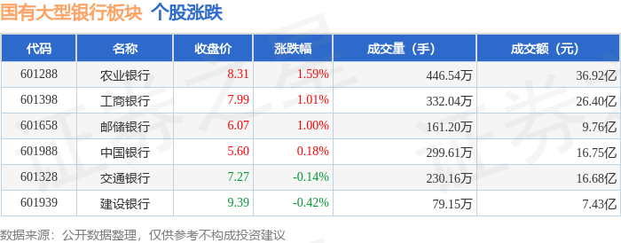 | 代码 | 名称 | 主力净流入 (元) | 主力净占比 游资净流入 (元) | | 游资净占比 散户净流入 (元) | | 散户净占比 | | --- | --- | --- | --- | --- | --- | --- | --- | | 601288 农业银行 | | 1.27亿 | 3.44% | 9023.54万 | 2.44% | -2.17 Z- | -5.88% | | 601398 工商银行 | | 8609.80万 | 3.26% | 2555.53万 | 0.97% | -1.12 Z | -4.23% | | 601939 建设银行 | | -394.76万 | -0.53% | 1991.03万 | 2.68% | -1596.26万 | -2.15% | | 601988 中国银行 | | -4821.83万 | -2.88% | 278.91万 | 0.17% | 4542.91万 | 2.71% | | 601658 邮储银行 | | -6371.64万 | -6.53% | 4000.80万 | 4.10% | 2370.83万 | 2.43% | | 601328 交通 ...