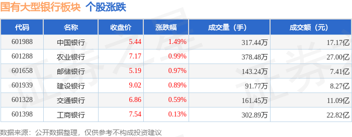从资金流向上来看,当日国有大型银行板块主力资金净流入7.21亿元,游资资金净流出5.44亿元,散户资 金净流出1.77亿元。国有大型银行板块个股资金流向见下表: 证券之星消息,1月20日国有大型银行板块较上一交易日上涨0.78%,中国银行领涨。当日上证指数报收 于4113.65,下跌0.01%。深证成指报收于14155.63,下跌0.97%。国有大型银行板块个股涨跌见下表: | 代码 | 名称 | 主力净流入 (元) | 主力净占比 游资净流入 (元) | | 游资净占比 散户净流入 (元) | | 散户净占比 | | --- | --- | --- | --- | --- | --- | --- | --- | | 601288 农业银行 | | 2.10亿 | 7.79% | -1.40 Z | -5.19% | -7008.96万 | -2.60% | | 601398 工商银行 | | 1.81亿 | 7.92% | -2.54亿 | -11.15% | 7357.95万 | 3.22% | | 601328 交通银行 | | 1.35 Z | 12.20% | -8338.39万 | -7.52% ...