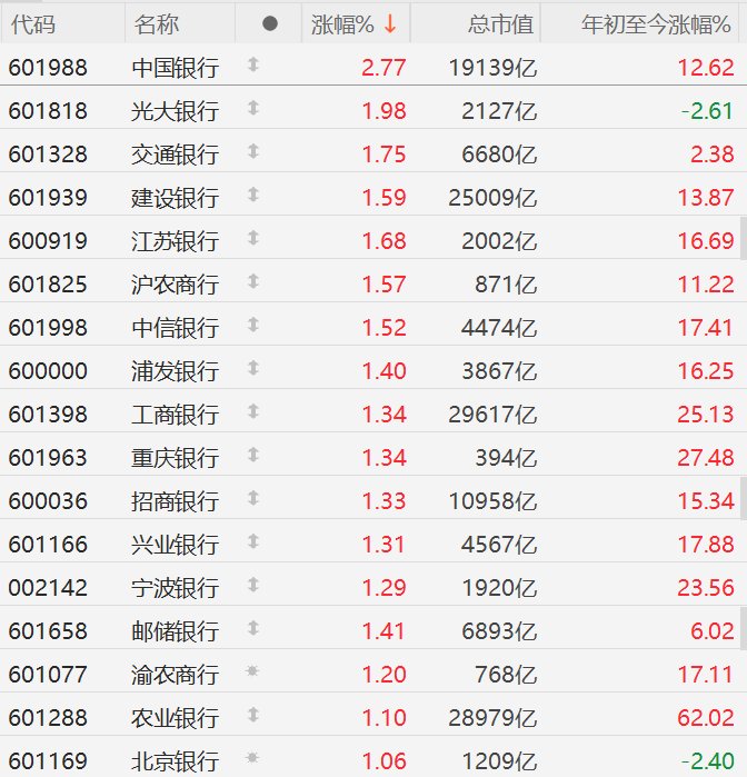 | 代码 | 名称 | | 涨幅% ↓ | 总市值 | 年初至今涨幅% | | --- | --- | --- | --- | --- | --- | | 601988 | 中国银行 | 1 | 2.77 | 19139亿 | 12.62 | | 601818 | 光大银行 | 1 | 1.98 | 2127亿 | -2.61 | | 601328 | 交通银行 | 1 | 1.75 | 6680 Z | 2.38 | | 601939 | 建设银行 | 1 | 1.59 | 25009亿 | 13.87 | | 600919 | 江苏银行 | 1 | 1.68 | 2002亿 | 16.69 | | 601825 | 沪衣商行 | 1 | 1.57 | 871亿 | 11.22 | | 601998 | 中信銀行 | 1 | 1.52 | 4474亿 | 17.41 | | 600000 | 浦发银行 | 1 | 1.40 | 3867亿 | 16.25 | | 601398 | 工商银行 | 1 | 1.34 | 29617亿 | 25.13 | | 601963 | 重庆银行 | 1 | 1.34 | ...