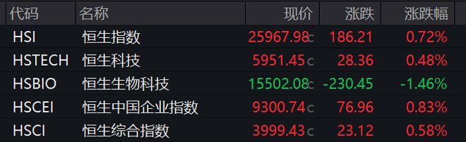 Group 1 - The Hang Seng Index closed at 25,967.98 points, up 0.72%, while the Hang Seng Tech Index closed at 5,951.45 points, up 0.48% [1][2] - The oil and banking sectors saw significant gains, with Postal Savings Bank rising over 4% [1] - The semiconductor and pharmaceutical sectors experienced declines, with Hua Hong Semiconductor and Shanghai Fudan both dropping over 4%, and Rongchang Bio falling nearly 11% [1] Group 2 - Gold stocks continued their downward trend, with Zhu Feng Gold down over 4% and Ling Bao Gold down over 2% [1] - Pop Mart saw a significant drop, falling over 9% [1]