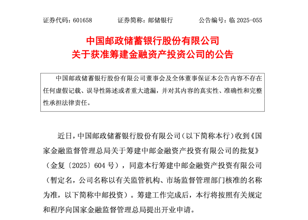 中国网财经10月28日讯 10月27日,邮储银行发布公告称,近日,该行收到《国家金融监督管理总局关 于筹建中邮金融资产投资有限公司的批复》(金复〔2025〕604号),同意邮储银行筹建中邮金融资产投 资有限公司(暂定名,公司名称以有关监管机构、市场监督管理部门核准的名称为准,以下简称中邮投 资)。筹建工作完成后,邮储银行将按照有关规定和程序向国家金融监督管理总局提出开业申请。中邮 投资注册资本为人民币100亿元,将作为邮储银行全资一级子公司管理。 ...