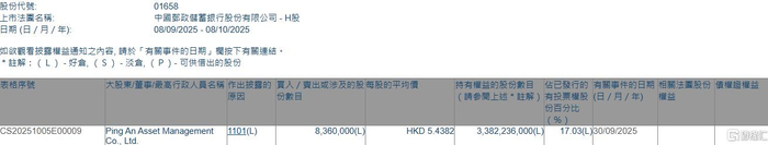 格隆汇10月8日丨根据联交所最新权益披露资料显示,2025年9月30日,邮储银行(01658.HK)获Ping An Asset Management Co., Ltd.在场内以每股均价5.4382港元增持836万股,涉资约4546.34万港元。 | 要 HEAR | 大股票/董事/股惠行政人員名稱 作出获羅的 員入 / 寶出或涉及的股每股的平均值 | | 持有權益的股份數目 佔已發行的 有關事件的日期 相關注黨股份 做權盛權益 | | --- | --- | --- | --- | | KER | | | (讀參閱上述*註解) 有投票權股(日 / 月 / 年) 權益 | | | | | 份自分比 | | | | | ( 96 ) | | CS20251005E00009 Ping An Asset Management 1101(L) | 8,360,000(L) | | HKD 5.4382 3,382,236,000(L) 17.03(L)30/09/2025 | | Co., Ltd. | | | | 增持后,Ping An Asset Management Co., Ltd.最新持股数目为3,382 ...