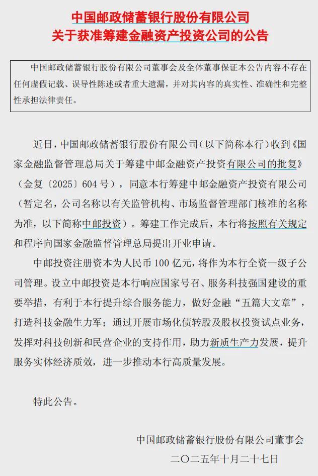 格隆汇10月27日丨邮储银行(01658.HK)公告,近日,中国邮政储蓄银行股份有限公司收到《国家金融监 督管理总局关于筹建中邮金融资产投资有限公司的批复》(金复〔2025〕604 号),同意该行筹建中邮金 融资产投资有限公司(暂定名,公司名称以有关监管机构、市场监督管理部门核准的名称为准,以下简 称中邮投资)。筹建工作完成后,该行将按照有关规定和程序向国家金融监督管理总局提出开业申请。 中邮投资注册资本为人民币 100 亿元,将作为该行全资一级子公司管理。设立中邮投资是该行响应国家 号召、服务科技强国建设的重要举措,有利于该行提升综合服务能力,做好金融"五篇大文章",打造科 技金融生力军;通过开展市场化债转股及股权投资试点业务,发挥对科技创新和民营企业的支持作用, 助力新质生产力发展,提升服务实体经济质效,进一步推动该行高质量发展。 ...