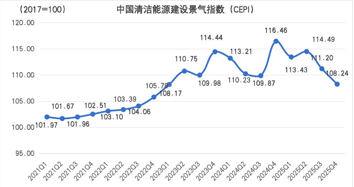Core Insights - The China Electric Power Construction Enterprise Association (CEPCA) released the Clean Energy Construction Prosperity Index (CEPI) and Power Construction Development Index (PCDI) for Q4 2025, indicating a stable recovery in the clean energy construction sector and an accelerated energy transition [1][11] CEPI Summary - The CEPI for Q4 2025 is 108.242, showing a year-on-year decrease of 8.22 points and a quarter-on-quarter decrease of 2.96 points, remaining within the prosperous range of 100-120 [2] - The index, based on 2017, focuses on hydropower, nuclear power, wind power, and solar power, with fluctuations attributed to a slowdown in the growth rate of new clean energy installed capacity [2] - By the end of 2025, the total installed power generation capacity reached 3.89 billion kilowatts, a year-on-year increase of 16.12%, with clean energy capacity at 2.35 billion kilowatts, accounting for over 60% [2] PCDI Summary - The PCDI for Q4 2025 is 93.29, showing a year-on-year decrease of 1.29 points but a quarter-on-quarter increase of 5.87 points, driven by improvements in all four sub-indices [9] - The economic efficiency sub-index performed best at 92.93, with a year-on-year increase of 3.53 points and a quarter-on-quarter increase of 9.15 points, despite slight declines in revenue and new contracts [10] - The green development sub-index is at 93.19, with a year-on-year decrease of 4.81 points but a quarter-on-quarter increase of 9.66 points, indicating a significant increase in non-fossil energy installed capacity [10] Investment and Capacity Insights - In Q4 2025, clean energy investment totaled 381 billion yuan, a year-on-year decrease of 23.97%, while the newly added power generation capacity was 17.944 million kilowatts, a year-on-year decrease of 5.88% but a quarter-on-quarter increase of 144.44% [2][5] - Clean energy generation reached 1,685.9 billion kilowatt-hours, a year-on-year increase of 20.65%, representing 53.34% of the national power generation, equivalent to a reduction of 138.4 million tons of CO2 emissions [5] Economic Context - In Q4 2025, China's GDP reached 38.791 trillion yuan, growing by 4.5% year-on-year and 1.2% quarter-on-quarter, with fixed asset investment (excluding rural households) at 11.3651 trillion yuan [11] - Power construction investment completed amounted to 695.8 billion yuan, with a quarter-on-quarter increase of 82.19%, reflecting its significance within fixed asset investment [11]