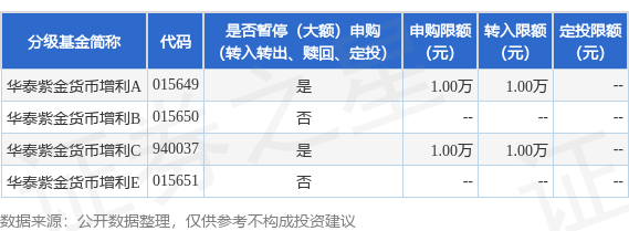 2、本基金已于2025年5月28日限制中欧财富基金、同花顺基金、创金启富基金、众禄基金、好买基金、 京东肯特瑞基金、度小满基金、玄元保险、长量基金、盈米基金、利得基金、云湾基金、奕丰基金单一 账户单日申购及转换转入A份额及C份额的金额为不超过1万元。 证券之星消息,12月1日华泰证券(上海)资产管理有限公司发布《关于调整华泰紫金货币增利货币市 场基金A份额及C份额部分代销渠道大额申购及大额转换转入等投资限额的公告》。公告中提示,为维 护基金份额持有人的利益,自2025年12月2日起调整华泰紫金货币增利货币市场基金A份额及C份额部分 代销渠道大额申购及大额转换转入等投资限额,下属分级基金调整明细如下: | 分级基金简称 代码 | 是否暂停(大额)申购 | 申购限额 | 转入限额 定投限额 | | | --- | --- | --- | --- | --- | | | (转入转出、赎回、定投) | (元) | (元) | (元) | | 华泰紫金货币增利A 015649 | 를 | 1.00万 | 1.00万 | | | 华泰紫金贷币增利B 015650 | KO | | | | | 华泰紫金货币增利C 9400 ...