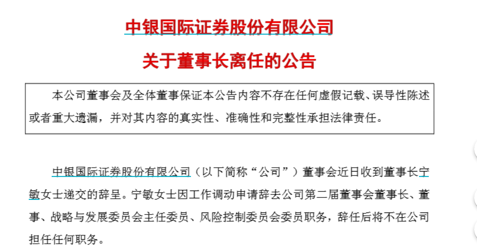 中银证券董事长宁敏辞任 “接棒”提名候选人来自中国银行总行