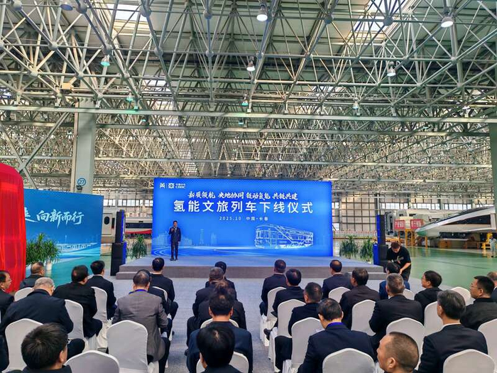 Core Viewpoint - The launch of the "Hydrogen Spring" tourist train marks a significant breakthrough in China's green rail transportation sector, showcasing the integration of hydrogen energy technology in public transport [2][4]. Group 1: Hydrogen Energy Train - The "Hydrogen Spring" train is equipped with a hydrogen energy power system, producing only water as a byproduct during operation, thus achieving zero carbon emissions [2]. - This train features characteristics such as environmental friendliness, smart comfort, and integration with tourism [2]. Group 2: Industry Conference - The China CRRC Modern Industrial Chain Integration Development Conference focuses on three major industrial chains: rail transit equipment, clean energy equipment, and hydrogen energy [4]. - The conference includes an exhibition showcasing hydrogen energy application scenarios, the Jilin hydrogen energy industry, hydrogen energy equipment, and integrated solutions for wind-solar-hydrogen storage [4].