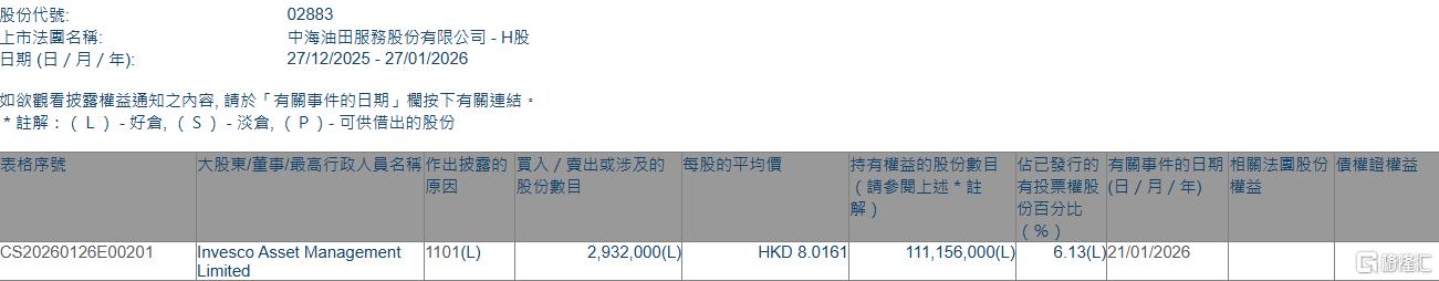 中海油田服务(02883.HK)获Invesco Asset Management增持293.2万股