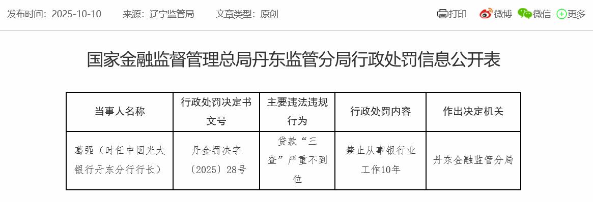 中国经济网北京10月10日讯 国家金融监督管理总局网站今日公布的丹东金融监管分局行政处罚信息公开表(丹金罚决字〔2025〕28号)显示,葛强 (时任中国光大银行丹东分行行长)被禁止从事银行业工作10年,主要违法违规行为是贷款"三查"严重不到位。 以下为原文: | 当事人名称 | 行政处罚决定书 | 主要违法违规 | 行政处罚内容 | 作出决定机关 | | --- | --- | --- | --- | --- | | | 文号 | 行为 | | | | 葛强 (时任中国光大 | 丹金罚决字 | 贷款"三 查"严重不到 | 禁止从事银行业 | 丹东金融监管分局 | | 银行丹东分行行长) | (2025) 28号 | | 工作10年 | | | | | 位 | | | (责任编辑:马先震) ...