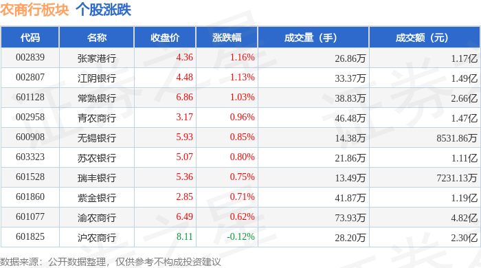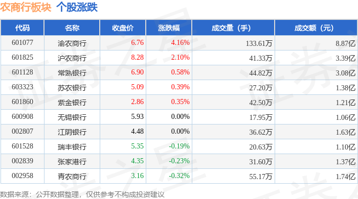 从资金流向上来看,当日农商行板块主力资金净流入5644.17万元,游资资金净流出1439.47万元,散户资 金净流出4204.7万元。农商行板块个股资金流向见下表: 证券之星消息,10月13日农商行板块较上一交易日上涨2.42%,渝农商行领涨。当日上证指数报收于 3889.5,下跌0.19%。深证成指报收于13231.47,下跌0.93%。农商行板块个股涨跌见下表: | 代码 | 名称 | 收盘价 | 涨跌幅 | 成交量(手) | 成交额(元) | | | --- | --- | --- | --- | --- | --- | --- | | 601077 | 渝农商行 | 6.76 | 4.16% | 133.61万 | | 8.87亿 | | 601825 | 沪农商行 | 8.28 | 2.10% | 41.33万 | | 3.39亿 | | 601128 | 常熟银行 | 6.90 | 0.58% | 0 44.82万 | | 3.08亿 | | 603323 | 苏农银行 | 5.09 | 0.39% | 27.20万 | | 1.38亿 | | 601860 | 紫金银行 | 2.86 | 0.3 ...
