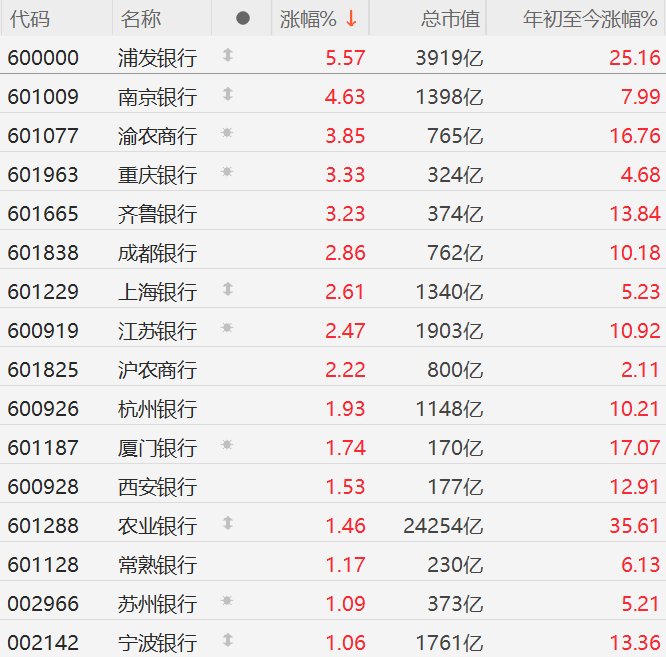 | 代码 | 名称 | | 涨幅% ↓ | 总市值 | 年初至今涨幅% | | --- | --- | --- | --- | --- | --- | | 600000 | 浦发银行 | 文 | 5.57 | 3919亿 | 25.16 | | 601009 | 南京银行 | 1 | 4.63 | 1398亿 | 7.99 | | 601077 | 渝农商行 | 费 | 3.85 | 765亿 | 16.76 | | 601963 | 重庆银行 | 安 | 3.33 | 324亿 | 4.68 | | 601665 | 齐鲁银行 | | 3.23 | 374亿 | 13.84 | | 601838 | 成都银行 | | 2.86 | 762亿 | 10.18 | | 601229 | 上海银行 | 1 | 2.61 | 1340亿 | 5.23 | | 600919 | 江苏银行 | 赛 | 2.47 | 1903亿 | 10.92 | | 601825 | 沪衣商行 | | 2.22 | 800亿 | 2.11 | | 600926 | 杭州银行 | | 1.93 | 1148亿 | 10.21 | | 6 ...