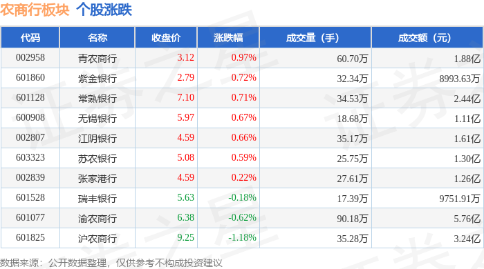 证券之星消息,1月5日农商行板块较上一交易日上涨0.09%,沪农商行领涨。当日上证指数报收于 4023.42,上涨1.38%。深证成指报收于13828.63,上涨2.24%。农商行板块个股涨跌见下表: | 代码 | 名称 | 收盘价 | 涨跌幅 | 成交量(手) | 成交额(元) | | --- | --- | --- | --- | --- | --- | | 601825 | 沪农商行 | 9.36 | 0.75% | 36.34万 | 3.37 Z | | 601860 | 紫金银行 | 2.77 | 0.36% | 26.38万 | 7295.54万 | | 002839 | 张家港行 | 4.58 | 0.22% | 29.71万 | 1.35亿 | | 601128 | 常熟银行 | 7.05 | 0.14% | - 36.61万 | 2.57亿 | | 600908 | 无锡银行 | 5.93 | 0.00% | 15.01万 | 8889.67万 | | 603323 | 苏农银行 | 5.05 | 0.00% | 23.05万 | 1.16亿 | | 002807 | 江阴银行 | 4.56 ...