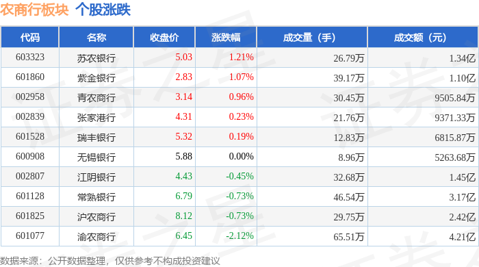 Core Insights - The rural commercial bank sector experienced a decline of 0.68% on October 9, with Yunnan Rural Commercial Bank leading the drop [1] - The Shanghai Composite Index closed at 3933.97, up 1.32%, while the Shenzhen Component Index closed at 13725.56, up 1.47% [1] Sector Performance - The following banks showed varying performance: - Su Nong Bank: Closed at 5.03, up 1.21% with a trading volume of 267,900 shares and a turnover of 134 million yuan [1] - Zijin Bank: Closed at 2.83, up 1.07% with a trading volume of 391,700 shares and a turnover of 110 million yuan [1] - Qing Nong Commercial Bank: Closed at 3.14, up 0.96% with a trading volume of 304,500 shares and a turnover of 95.06 million yuan [1] - Zhangjiagang Bank: Closed at 4.31, up 0.23% with a trading volume of 217,600 shares and a turnover of 93.71 million yuan [1] - Ruifeng Bank: Closed at 5.32, up 0.19% with a trading volume of 128,300 shares and a turnover of 68.16 million yuan [1] - Wuxi Bank: Closed at 5.88, unchanged with a trading volume of 89,600 shares and a turnover of 52.64 million yuan [1] - Jiangyin Bank: Closed at 4.43, down 0.45% with a trading volume of 326,800 shares and a turnover of 145 million yuan [1] - Changshu Bank: Closed at 6.79, down 0.73% with a trading volume of 465,400 shares and a turnover of 317 million yuan [1] - Hu Nong Bank: Closed at 8.12, down 0.73% with a trading volume of 297,500 shares and a turnover of 242 million yuan [1] - Yunnan Rural Commercial Bank: Closed at 6.45, down 2.12% with a trading volume of 655,100 shares and a turnover of 421 million yuan [1] Capital Flow Analysis - The rural commercial bank sector saw a net outflow of 9.51 million yuan from main funds, while speculative funds had a net inflow of 59.77 million yuan, and retail investors experienced a net outflow of 50.26 million yuan [1] - Specific capital flows for selected banks include: - Yunnan Rural Commercial Bank: Main funds net inflow of 61.64 million yuan, speculative funds net inflow of 21.83 million yuan, and retail net outflow of 83.48 million yuan [2] - Ruifeng Bank: Main funds net inflow of 4.05 million yuan, speculative funds net outflow of 1.54 million yuan, and retail net outflow of 2.51 million yuan [2] - Qing Nong Commercial Bank: Main funds net inflow of 2.37 million yuan, speculative funds net outflow of 6.20 million yuan, and retail net outflow of 3.83 million yuan [2] - Zhangjiagang Bank: Main funds net inflow of 1.55 million yuan, speculative funds net outflow of 3.13 million yuan, and retail net inflow of 1.58 million yuan [2] - Wuxi Bank: Main funds net outflow of 0.93 million yuan, speculative funds net inflow of 0.63 million yuan, and retail net inflow of 0.30 million yuan [2] - Zijin Bank: Main funds net outflow of 1.10 million yuan, speculative funds net inflow of 3.72 million yuan, and retail net outflow of 2.62 million yuan [2] - Jiangyin Bank: Main funds net outflow of 5.86 million yuan, speculative funds net outflow of 11.33 million yuan, and retail net inflow of 17.19 million yuan [2] - Hu Nong Bank: Main funds net outflow of 6.30 million yuan, speculative funds net inflow of 6.54 million yuan, and retail net outflow of 0.25 million yuan [2] - Su Nong Bank: Main funds net outflow of 22.55 million yuan, speculative funds net inflow of 20.66 million yuan, and retail net inflow of 0.19 million yuan [2] - Changshu Bank: Main funds net outflow of 42.38 million yuan, speculative funds net inflow of 28.58 million yuan, and retail net inflow of 13.80 million yuan [2]