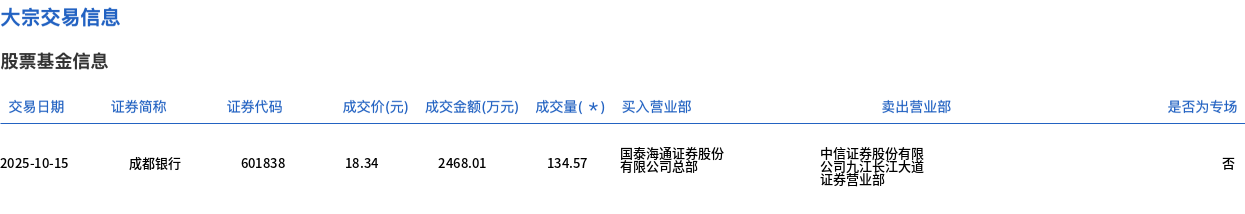 | 交易日期 | 证券简称 | 证券代码 | 成交价(元) 成交金额(万元) 成交量( * ) 买入营业部 | | | | | 卖出营业部 | | --- | --- | --- | --- | --- | --- | --- | --- | --- | | 2025-10-15 | 成都银行 | 601838 | 18.34 | 2468.01 | 134.57 | 国泰海通证券股份 有限公司总部 | 中信证券股党更暨 | | 10月15日,成都银行大宗交易成交134.57万股,成交额2468.01万元,占当日总成交额的4.76%,成交价18.34元,较市场收盘价18.34元持平。 ...