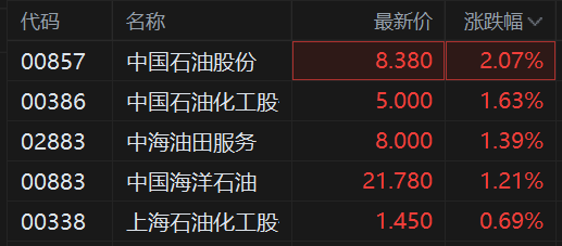 | 代码 | 名称 | 最新价 | 涨跌幅 √ | | --- | --- | --- | --- | | 00857 | 中国石油股份 | 8.380 | 2.07% | | 00386 | 中国石油化工股 | 5.000 | 1.63% | | 02883 | 中海油田服务 | 8.000 | 1.39% | | 00883 | 中国海洋石油 | 21.780 | 1.21% | | 00338 | 上海石油化工股 | 1.450 | 0.69% | 港股石油股盘初集体拉升,中国石油股份涨超2%,中国石油化工涨1.6%刷新阶段新高,中国海洋石油 涨1.2%,中国油田服务、上海石油化工跟涨。 消息上,昨夜美盘,国际油价收涨超1.5%。光大证券发布研报称,当前美联储重启降息周期,全球贸 易冲突风险仍具不确定性,建议关注26年需求预期变化对油价的影响。本周伊朗地缘局势紧张程度加 剧,原油的地缘政治风险溢价上升,油价上涨。 另外,OPEC+已决定26Q1暂缓增产,未来有望根据原油市场变化决定原油产量,本次暂停增产有望改 善市场对原油供给端的担忧。 ...