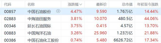港股石油股逆势走强,其中,中国石油股份涨超4%,中海油田服务、延长石油国际、中国海洋石油涨 超3%创历史新高。消息面上,国际油价走高,市场忧虑美国与伊朗紧张局势升级,两国在中东产油区 加强军事活动。 | 代码 | 名称 | 涨跌幅 √ | 最新价 | 总市值 | 年初至今涨跌 | | --- | --- | --- | --- | --- | --- | | 00857 | 中国石油股份 | (0) 4.47% | 9.590 | 1.76万亿 | 14.44% | | 02883 | 中海油田服务 | 3.81% | 10.070 | 480.5亿 | 44.06% | | 00346 | 延长石油国际 | 3.75% | 0.415 | 4.57亿 | 13.70% | | 00883 | 中国海洋石油 | 3.26% | 25.960 | 1.23万亿 | 21.88% | | 00386 | 中国石油化工股份 | 0.74% | 5.480 | 6626.72亿 | 17.34% | ...