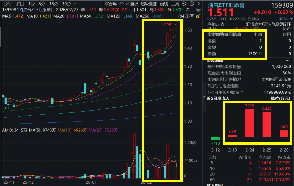 油价再度飙升,油气板块冲高!油气ETF汇添富(159309)盘中价创新高,冲击四连阳,强势吸金超1800万元!关注地缘局势影响下的石油板块!