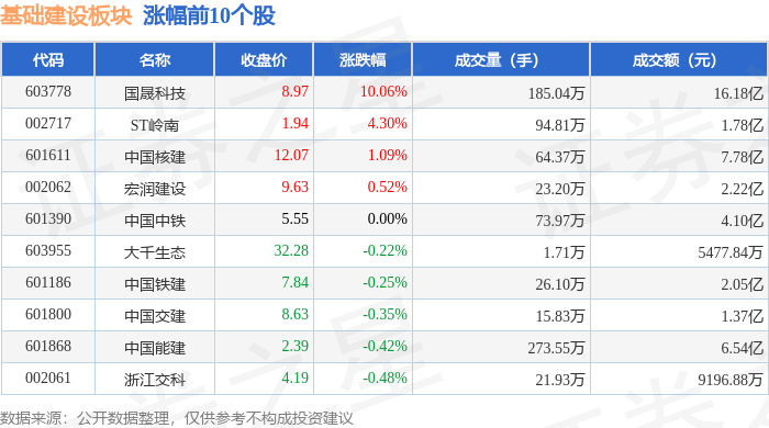 证券之星消息,11月19日基础建设板块较上一交易日下跌0.53%,诚邦股份领跌。当日上证指数报收于 3946.74,上涨0.18%。深证成指报收于13080.09,下跌0.0%。基础建设板块个股涨跌见下表: | 代码 | 名称 | 收盘价 | 涨跌幅 | 成交量(手) | 成交额(元) | | | --- | --- | --- | --- | --- | --- | --- | | 603778 | 国晟科技 | 8.97 | 10.06% | 185.04万 | | 16.18亿 | | 002717 | ST岭南 | 1.94 | 4.30% | 94.81万 | | 1.78亿 | | 601611 | 中国核建 | 12.07 | 1.09% | 64.37万 | | 7.78亿 | | 002062 | 宏润建设 | 9.63 | 0.52% | 1 23.20万 | | 2.22亿 | | 601390 | 中国中铁 | 5.55 | 0.00% | 73.97万 | | 4.10亿 | | 603955 | 大千生态 | 32.28 | -0.22% | 1.71万 | | 5477.84万 ...