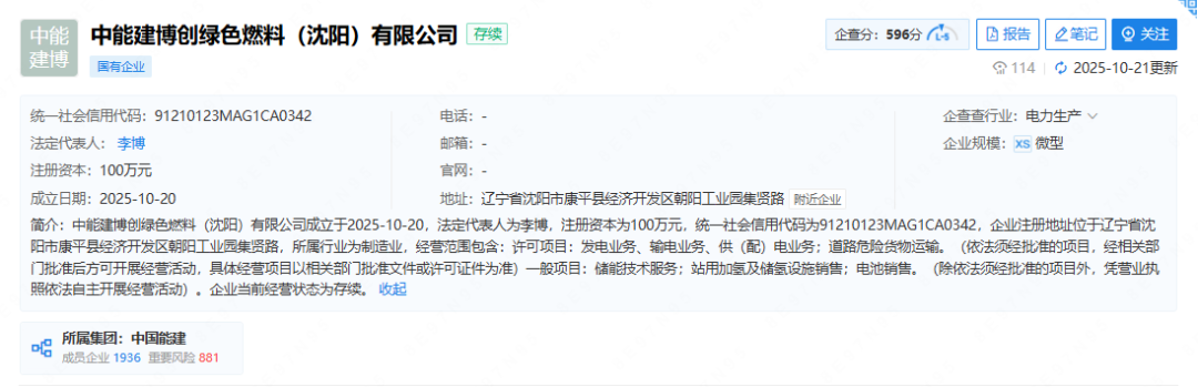 Group 1 - A new company named China Energy Construction Bochuang Green Fuel (Shenyang) Co., Ltd. has been established, with Li Bo as the legal representative [1] - The company's business scope includes power generation, transmission, distribution, energy storage technology services, hydrogen refueling and storage facility sales, and battery sales [1] - The company is indirectly wholly owned by China Energy Construction [3]