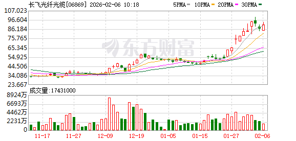 智通财经APP获悉,长飞光纤光缆(06869)今早一度冲高涨逾8%%,现涨幅收窄。截至发稿,涨3.06%, 报89.15港元,成交额14.12亿港元。 消息面上,根据华泰证券研报,2026年1月,中国市场G.652.D单模光纤价格创下近七年来的新高,平均 价格来到35元/芯公里以上。国泰海通证券指出,近期散纤价格持续上涨。该行认为临近电信、移动运 营商集采,以及春节前行业备货需求更盛,预料价格还将持续涨高。在此背景下,该行认为国内市场大 客户也有望接受涨价,板块波动中得以确认。看好国内光纤光缆头部厂商充分受益光纤光缆需求爆发下 的涨价大趋势,利润弹性有望不断上修。 ...